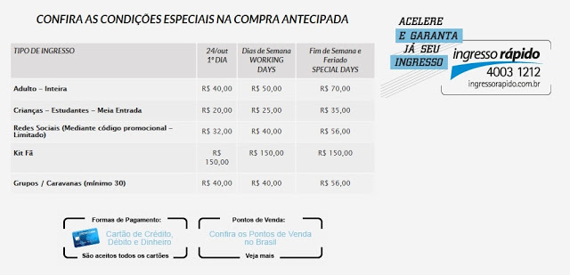Os compradores que quiserem adquirir antecipadamente os ingressos para o “27º Salão Internacional do Automóvel”, que será realizado entre os dias 24 de outubro e 04 de novembro, já podem acelerar e garantir as entradas para a festa automotiva. Basta clicar neste link e conhecer todas as opções para a compra, incluindo a venda pelo telefone através do Ingresso Rápido. Clique na imagem para ampliar a foto.